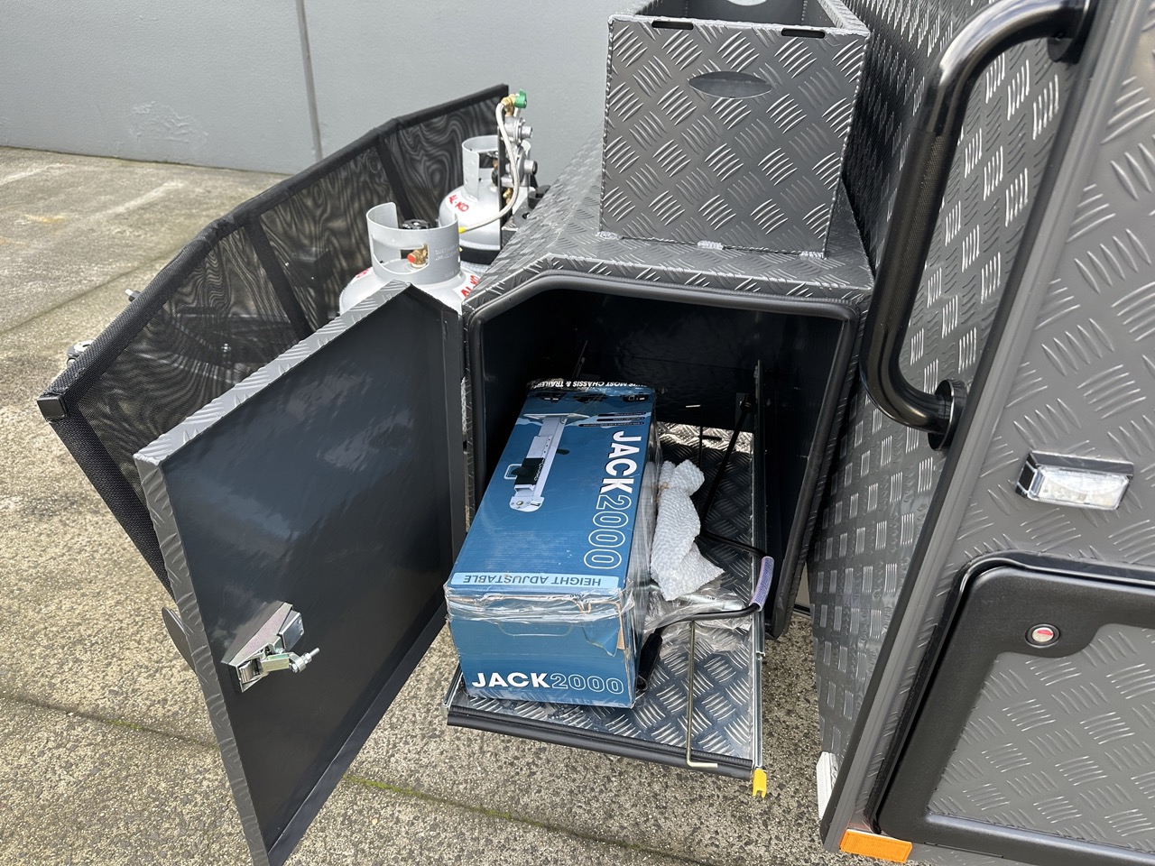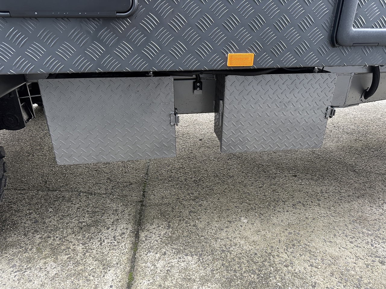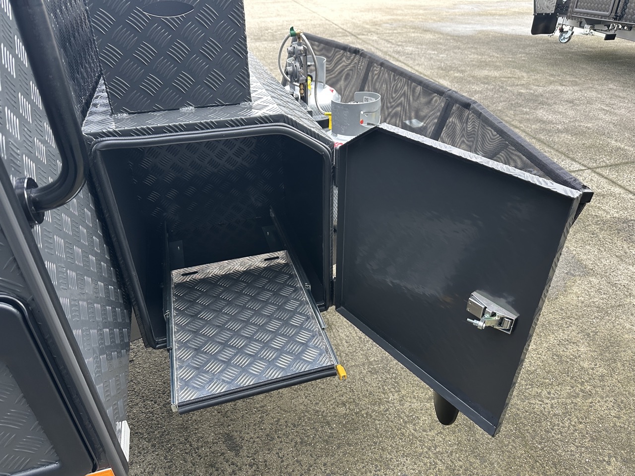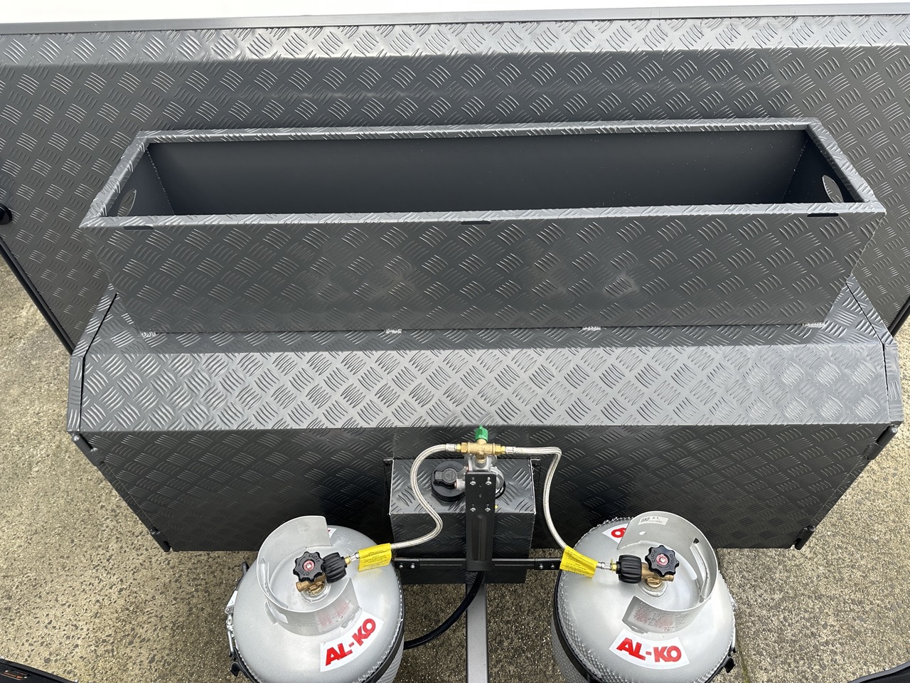Large Powder Coated Checker Plate Toolbox with Slide-Out’s on Each Side & Top Mounted Woodbox