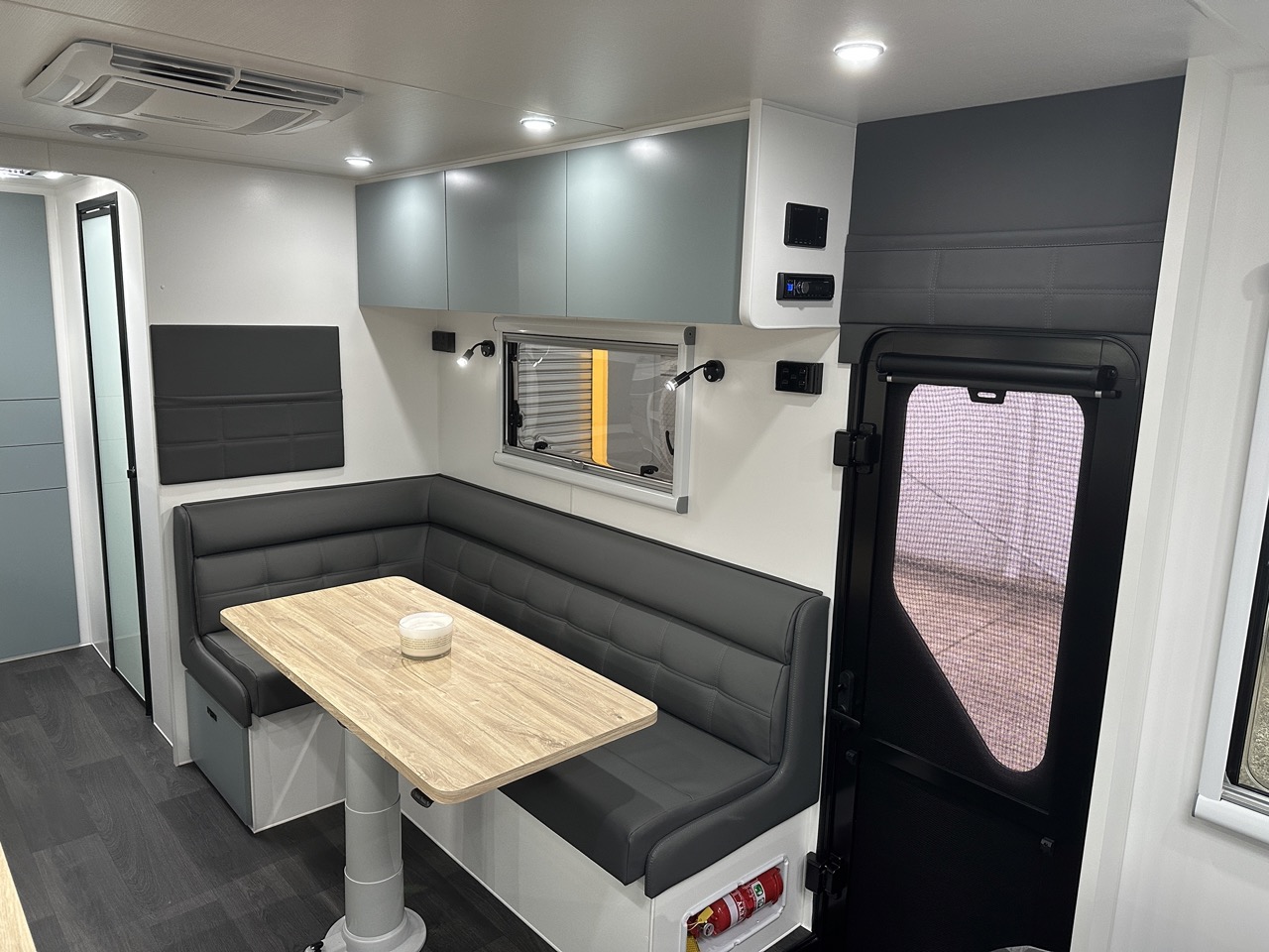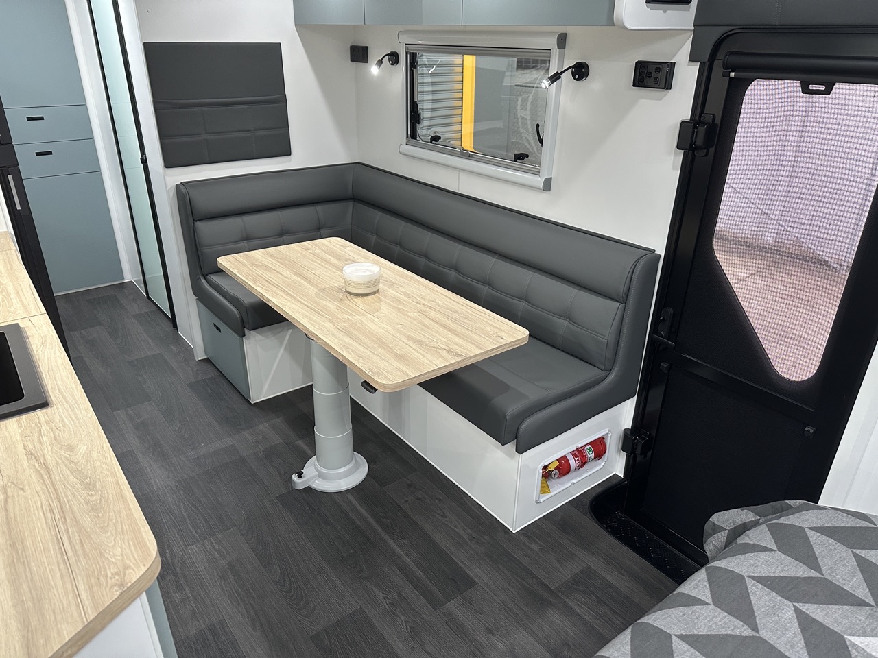 L-shaped dinette with map reading lights & magazine pouch