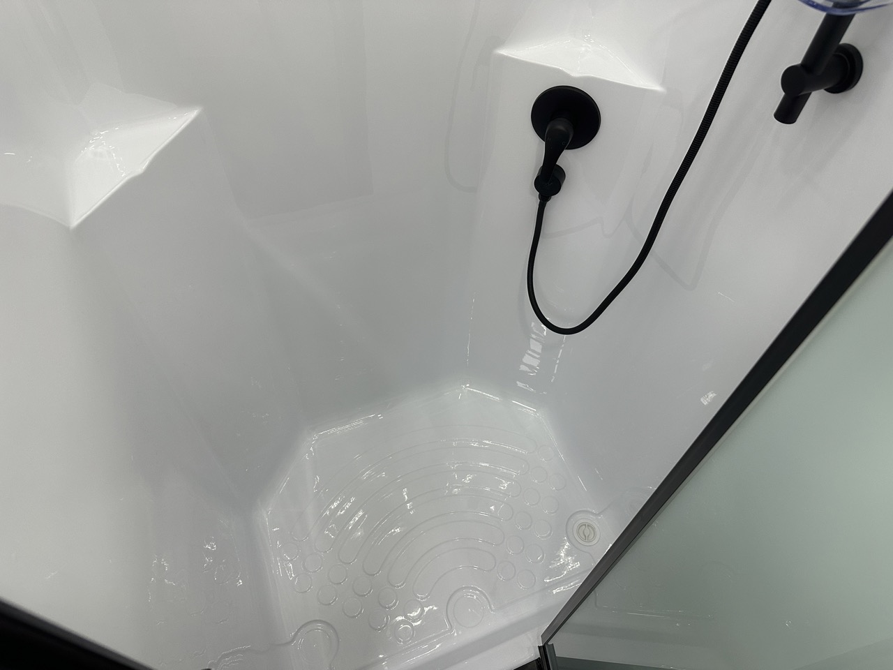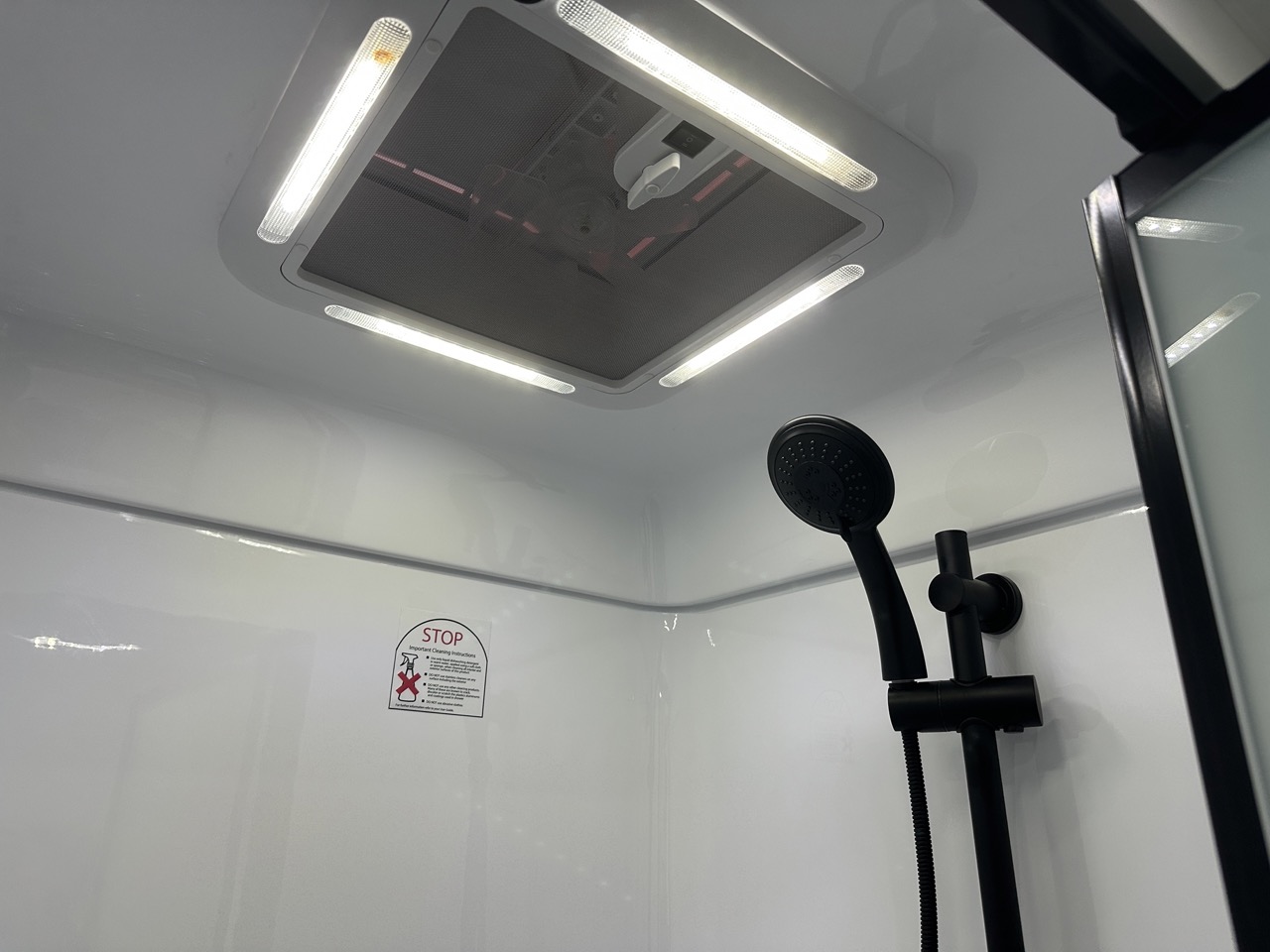 One-piece fibreglass shower with hatch/fan