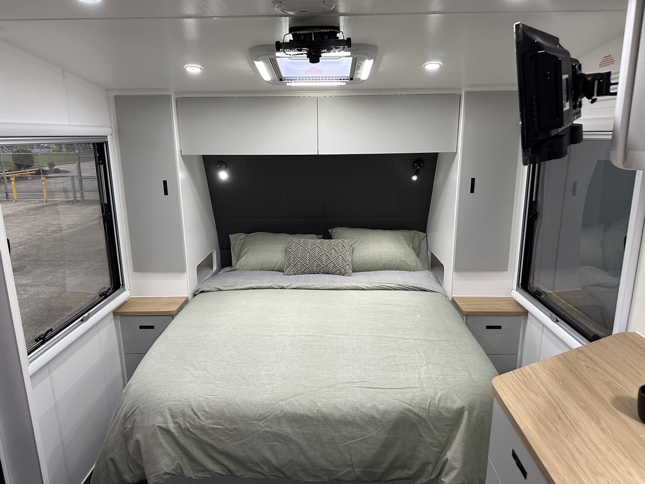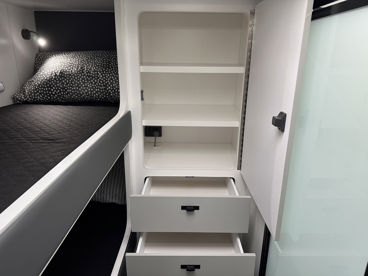 3 bunks with map reading lights, USBs, bedheads & large windows