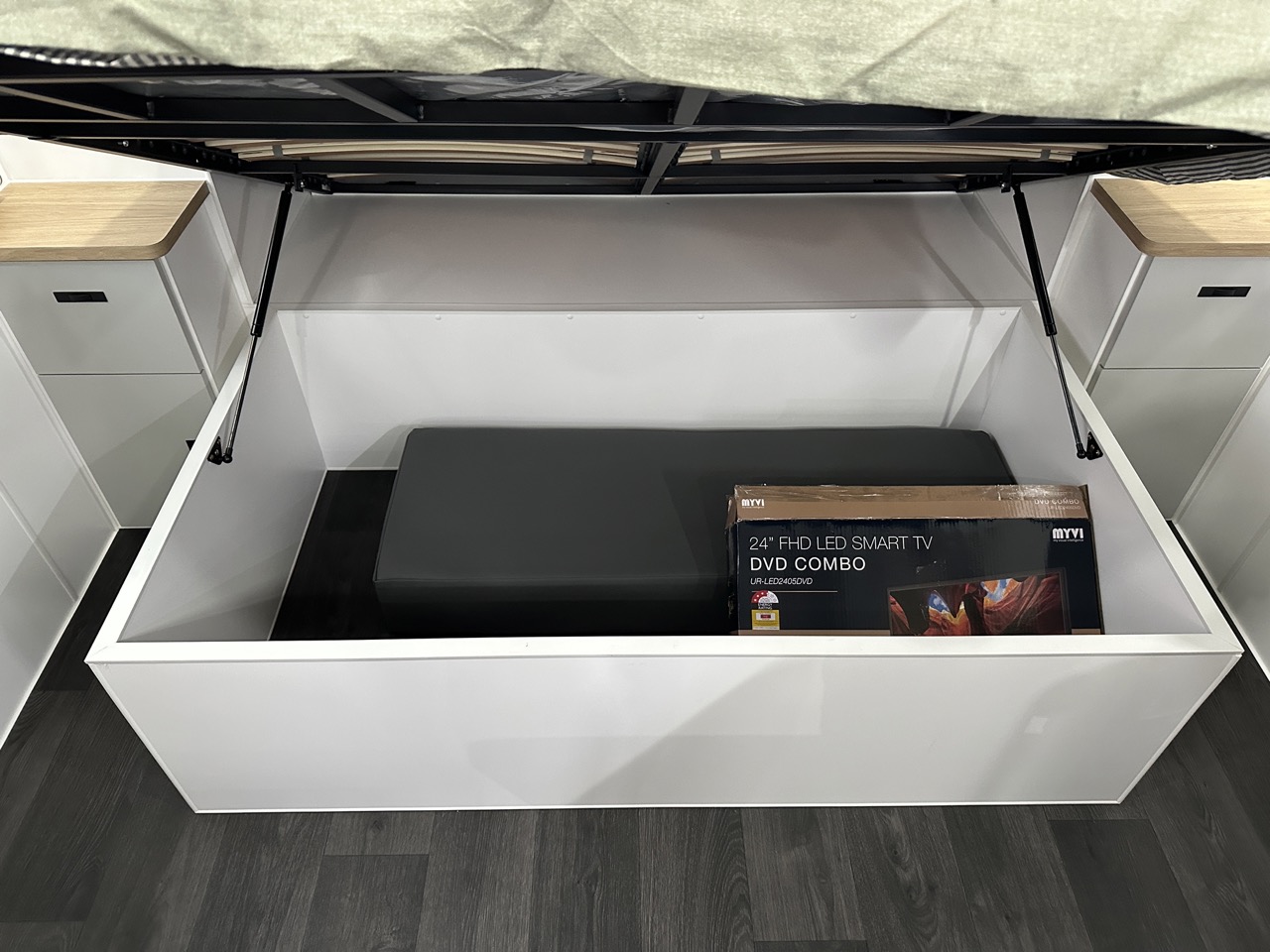 Island bed with pillow top mattress and storage beneath
