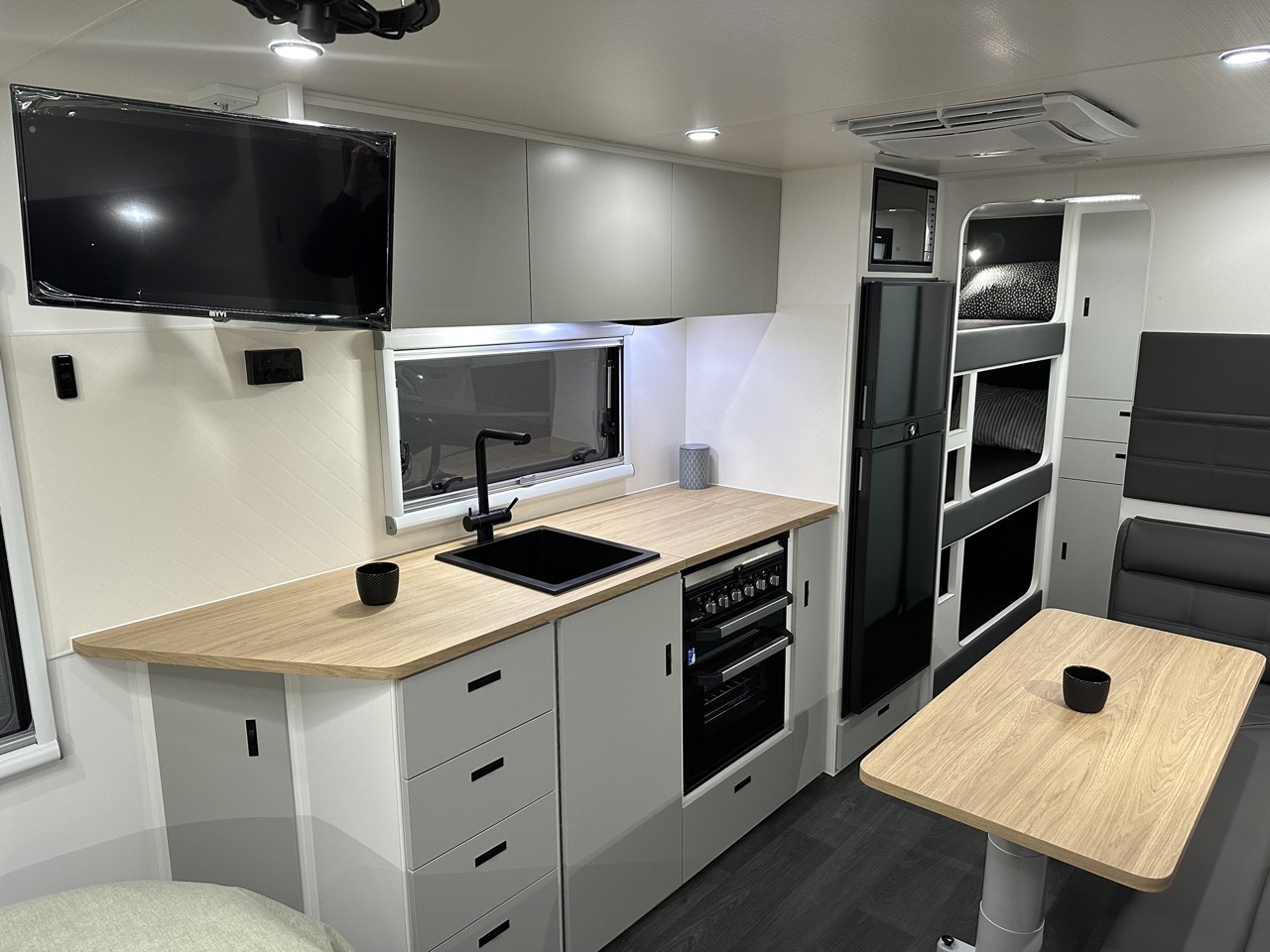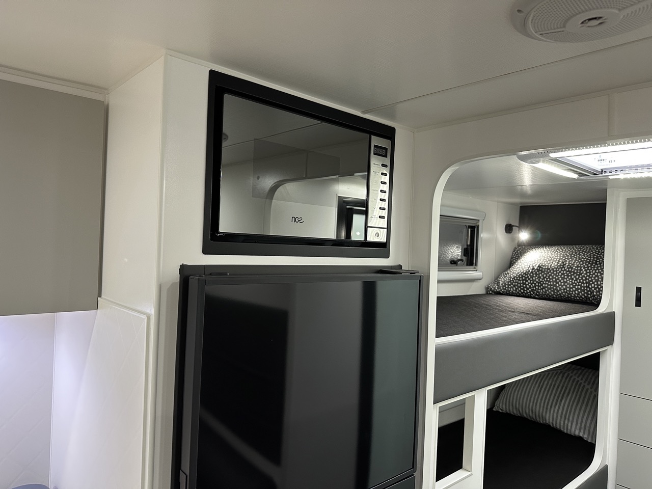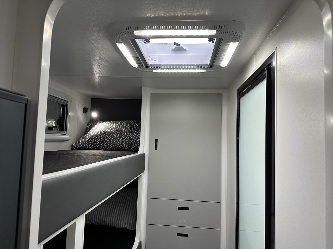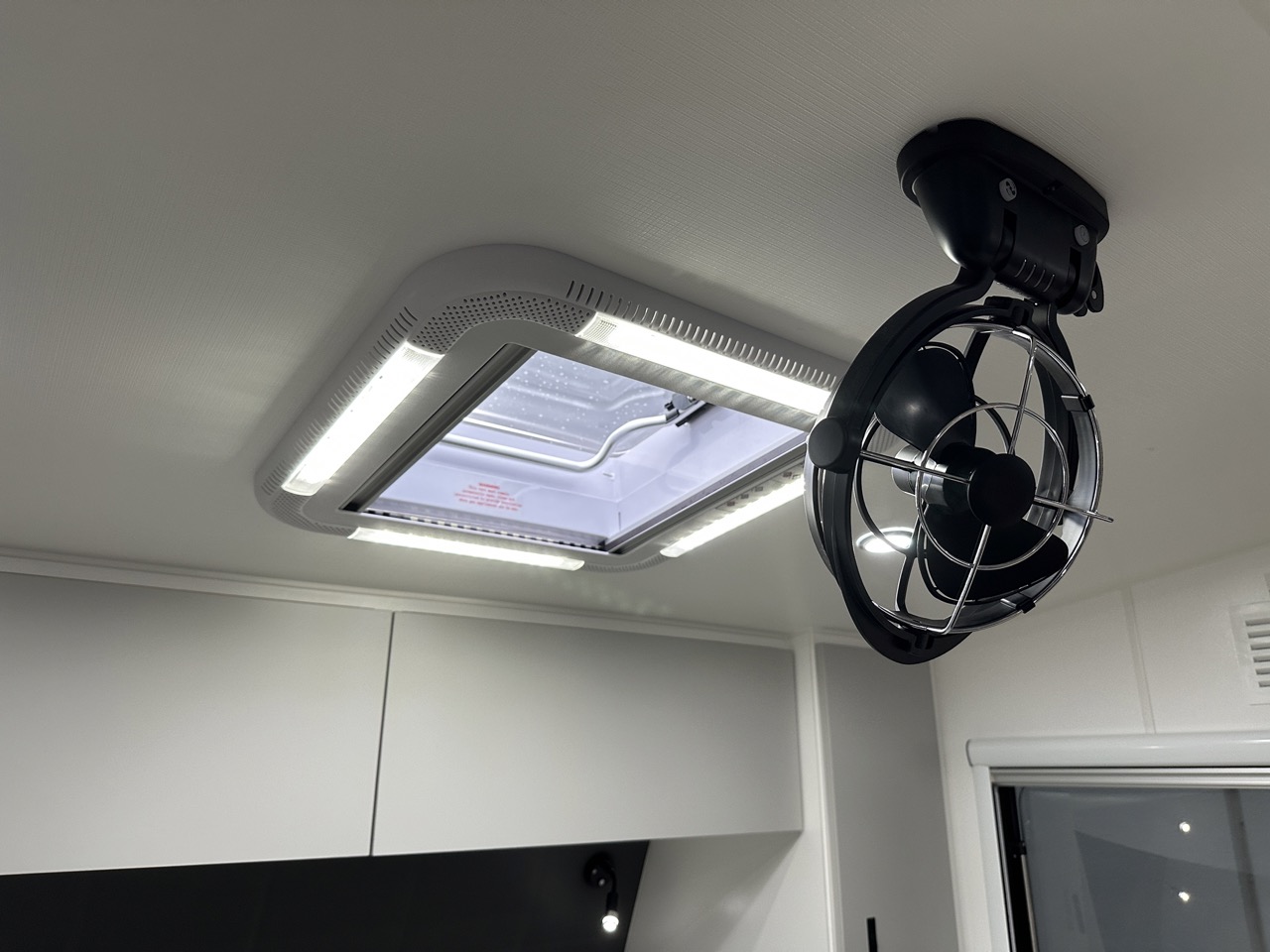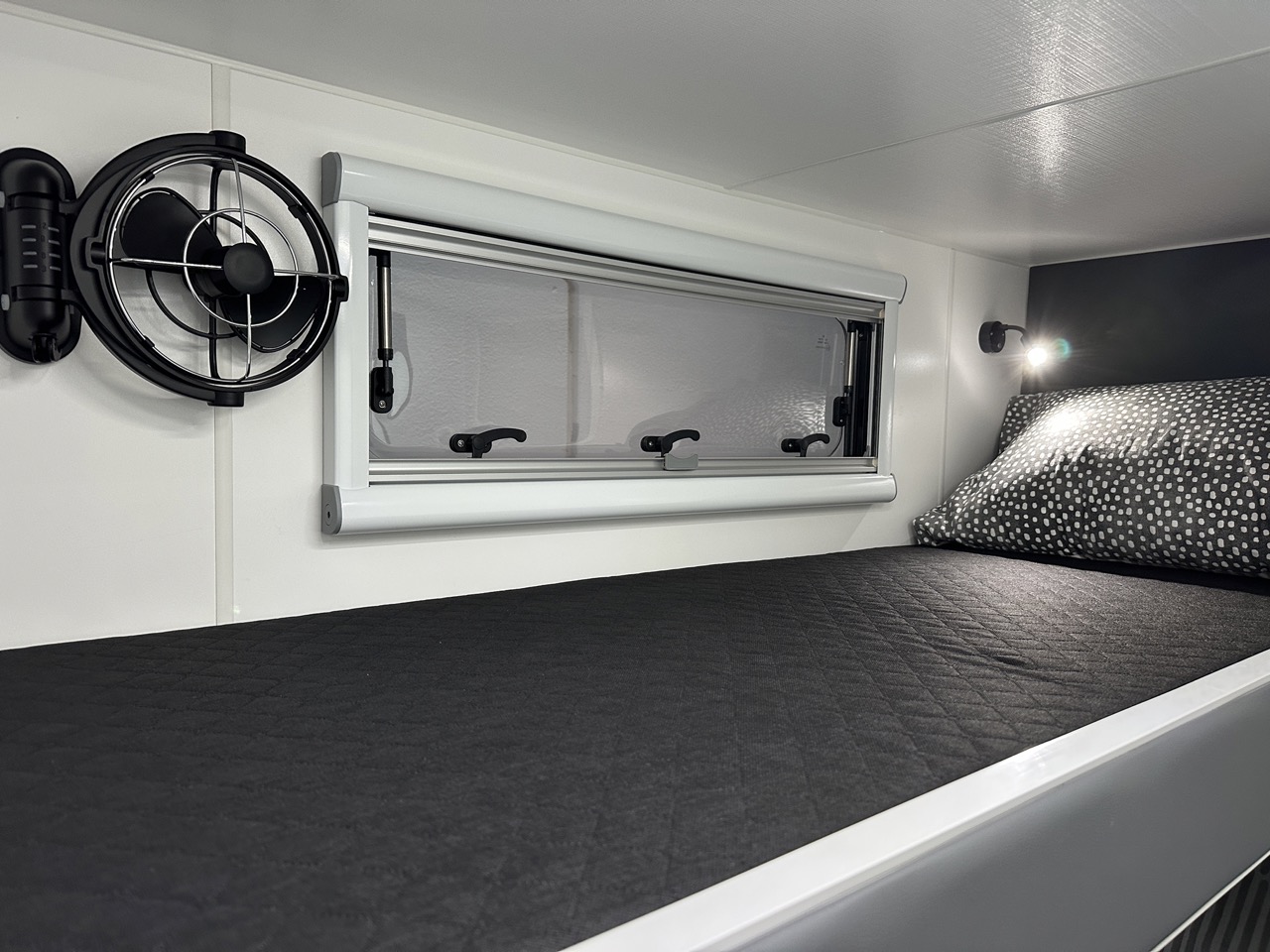 – 12v fan above island bed, 3 x 12v fans in bunks