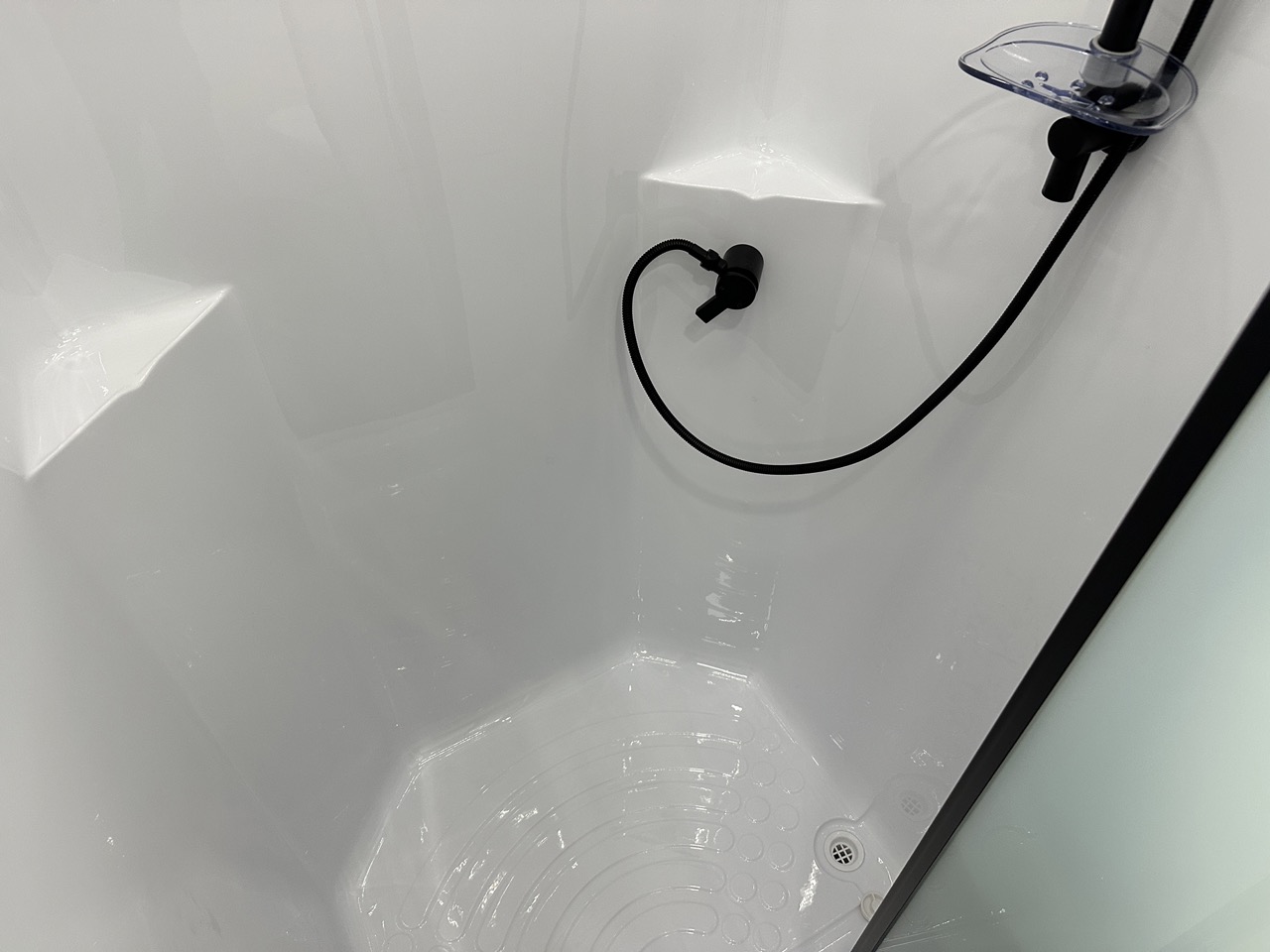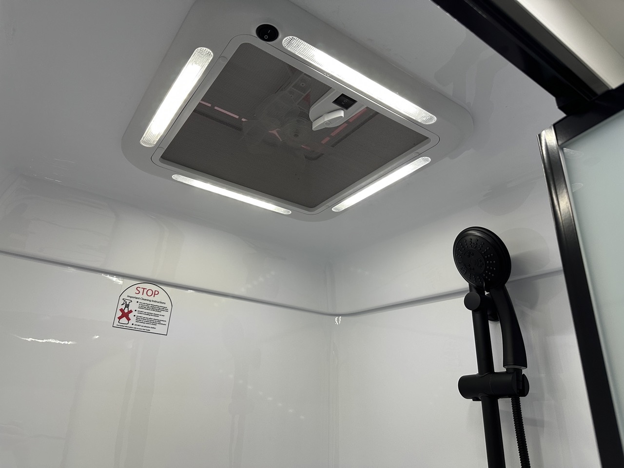 One-piece fibreglass shower with hatch/fan