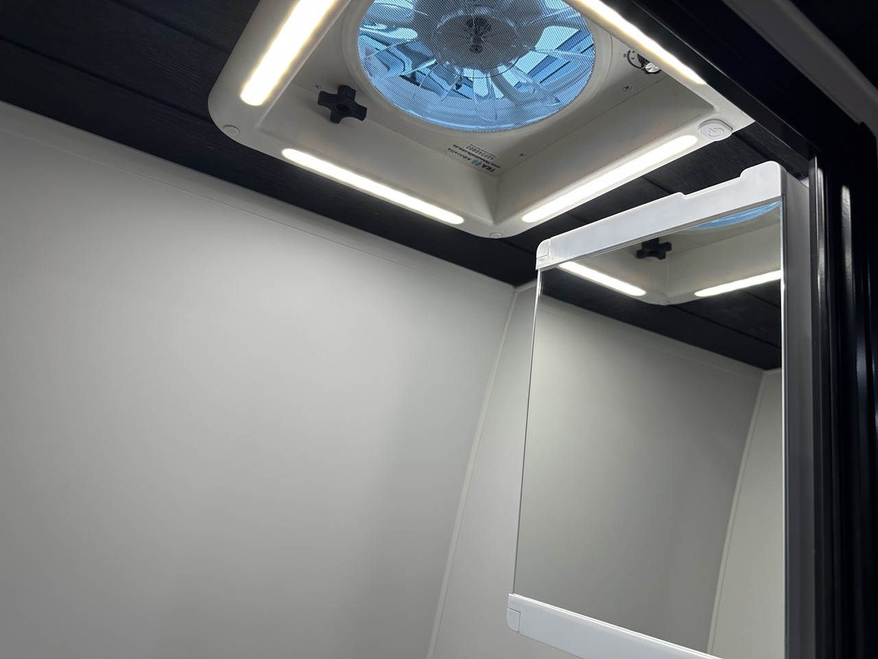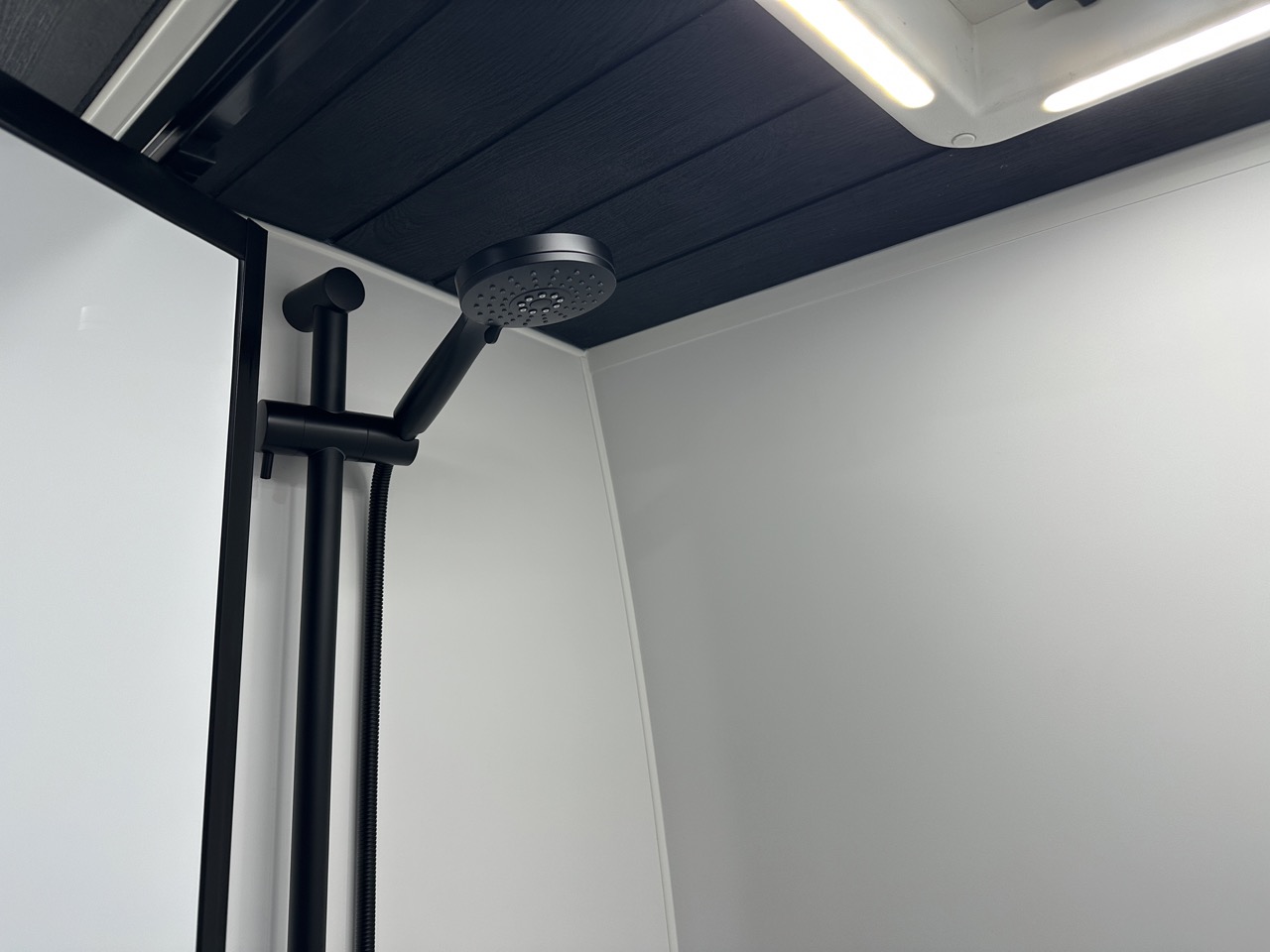 Shower with mirror door, black shower head, hatch/fan & soapbox with mirror