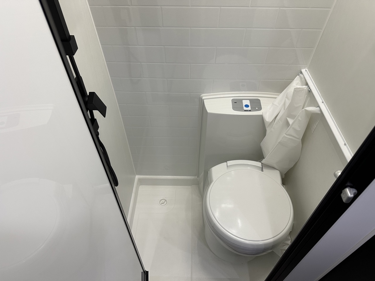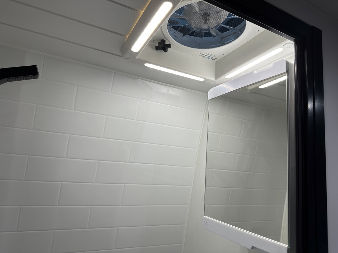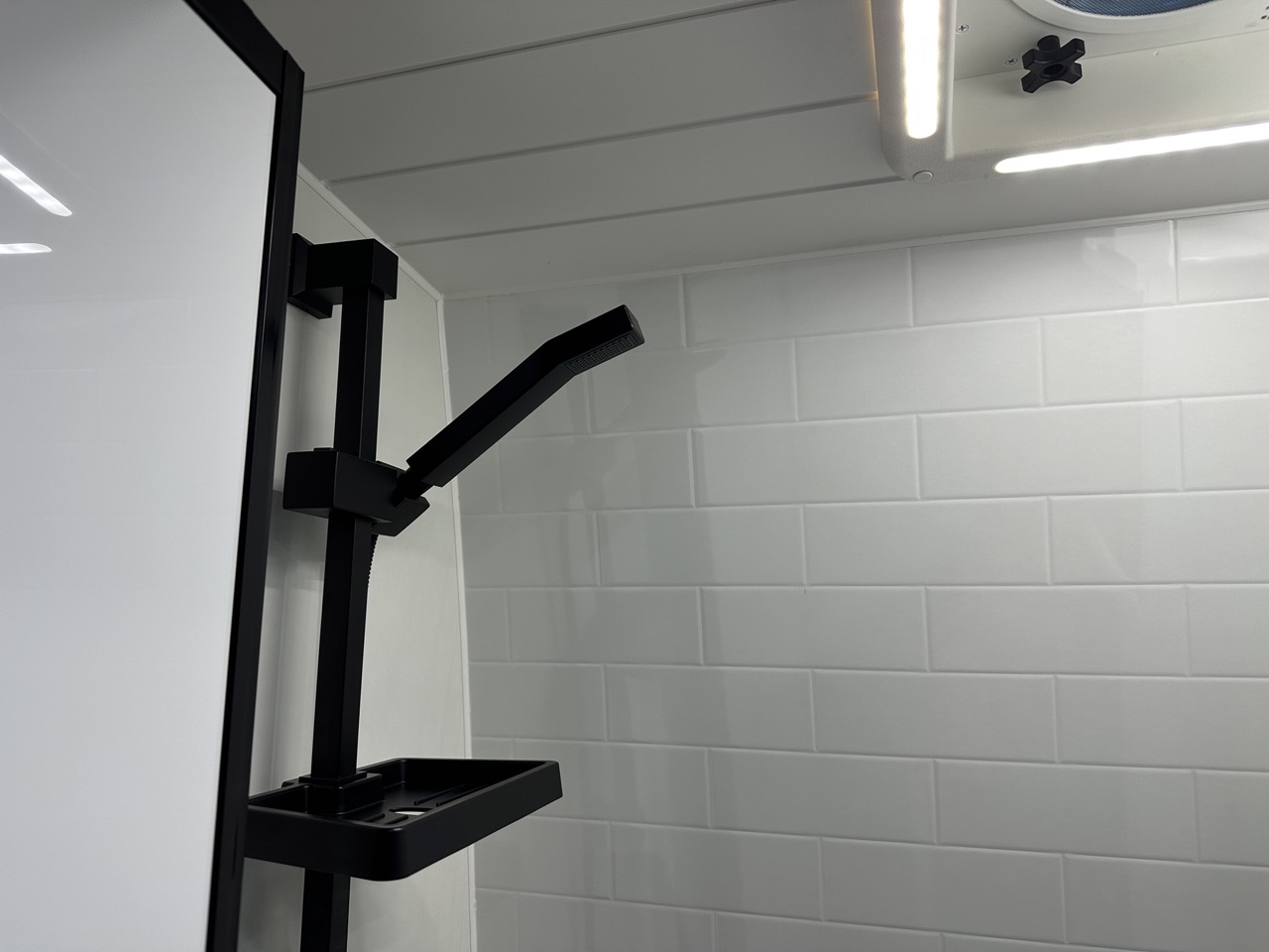 Shower with mirror door, black shower head, hatch/fan & soapbox with mirror