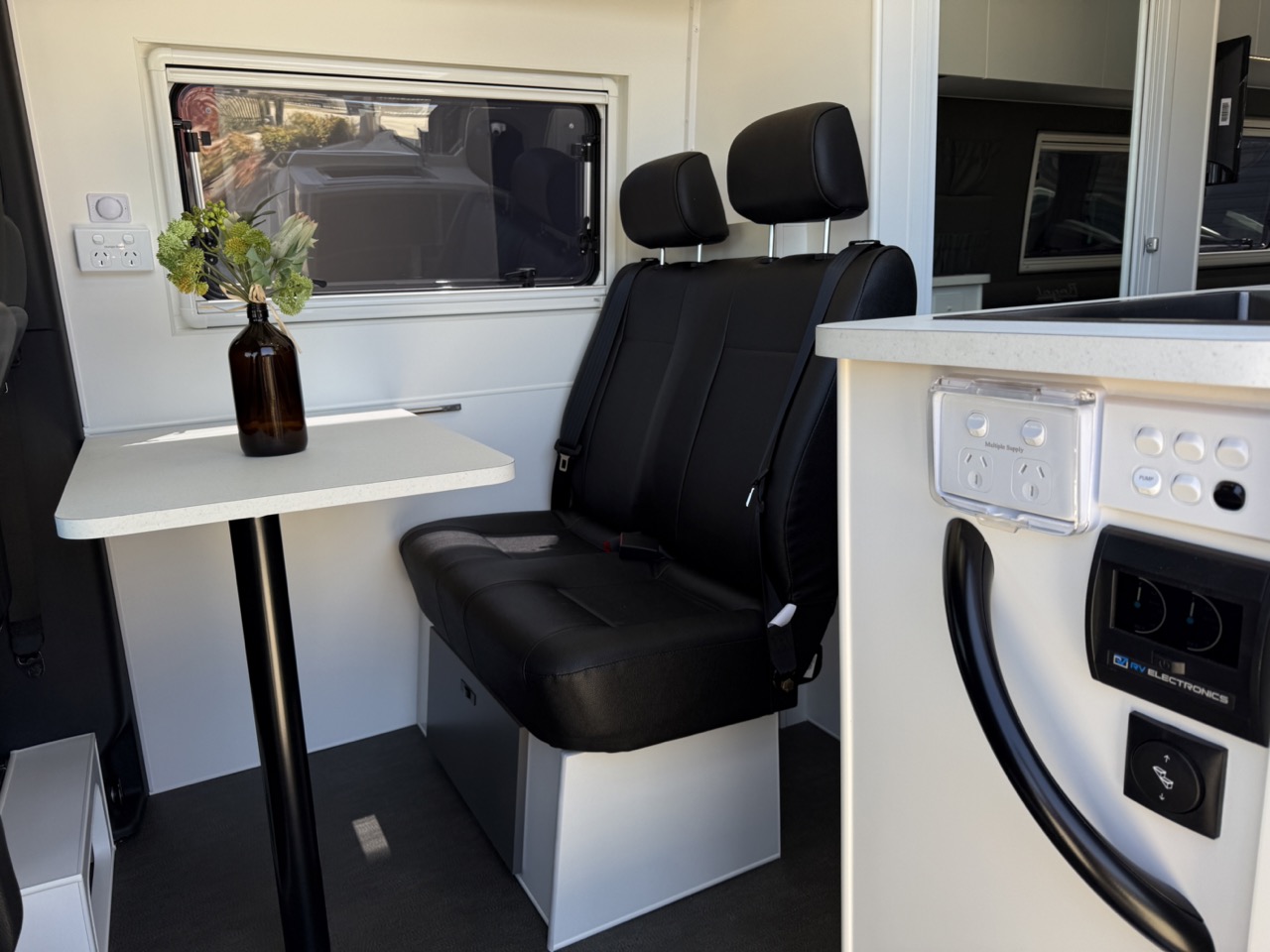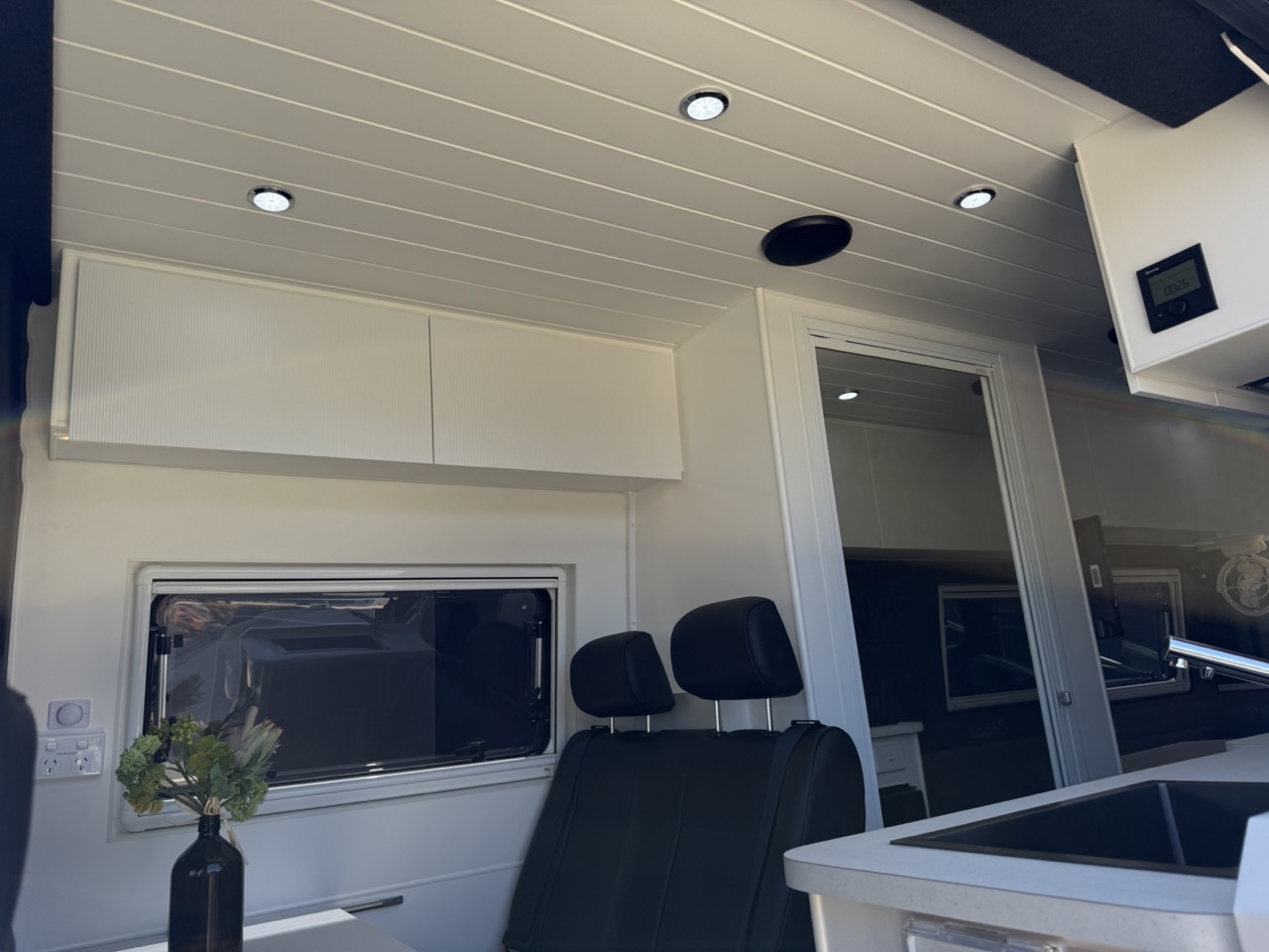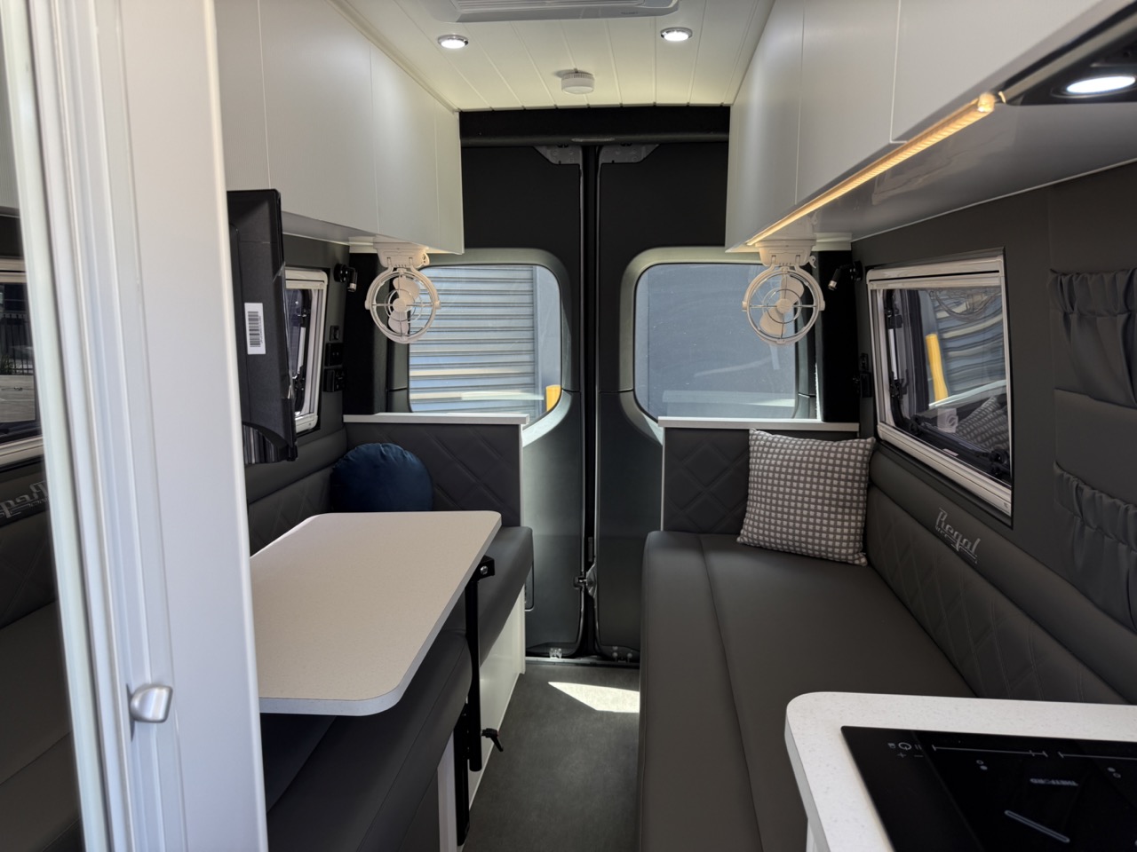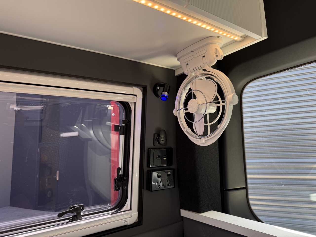 Large seating/sleeping area with map reading lights, USB/USBC Ports, LED strip lighting, double power points & 2 x Adjustable fans