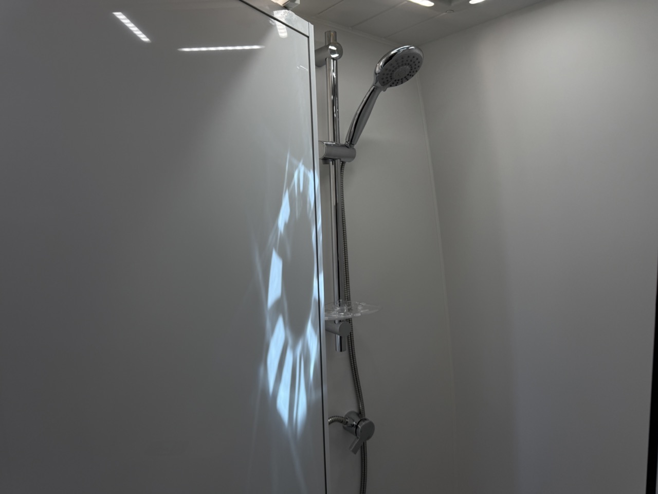 Shower with mirror door, black shower head, hatch/fan, sink & soapbox with mirror