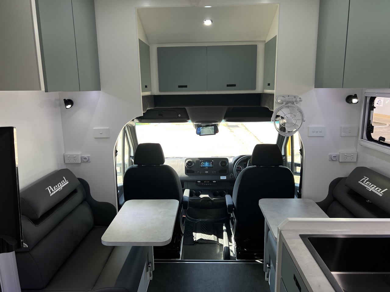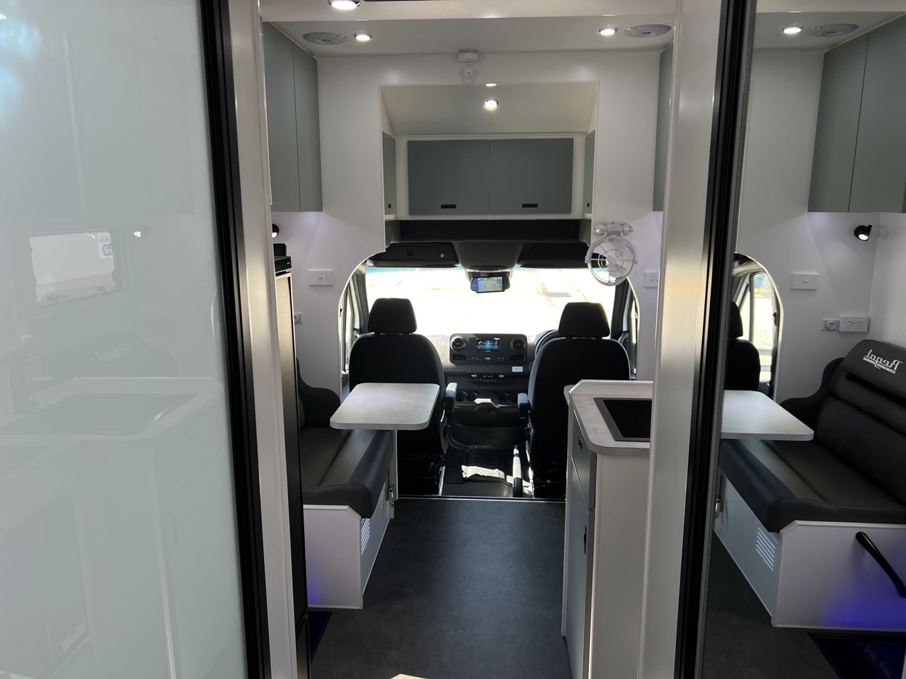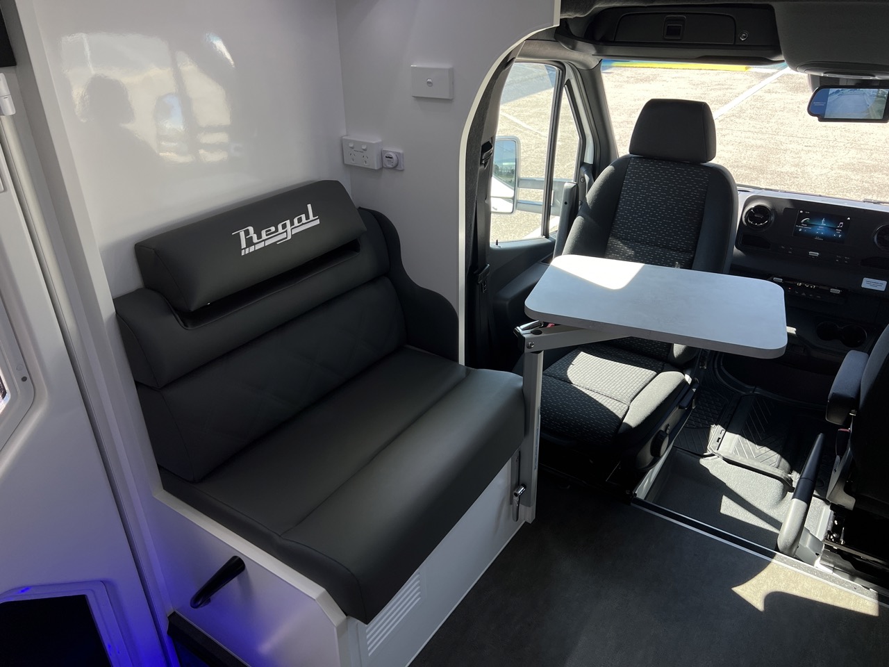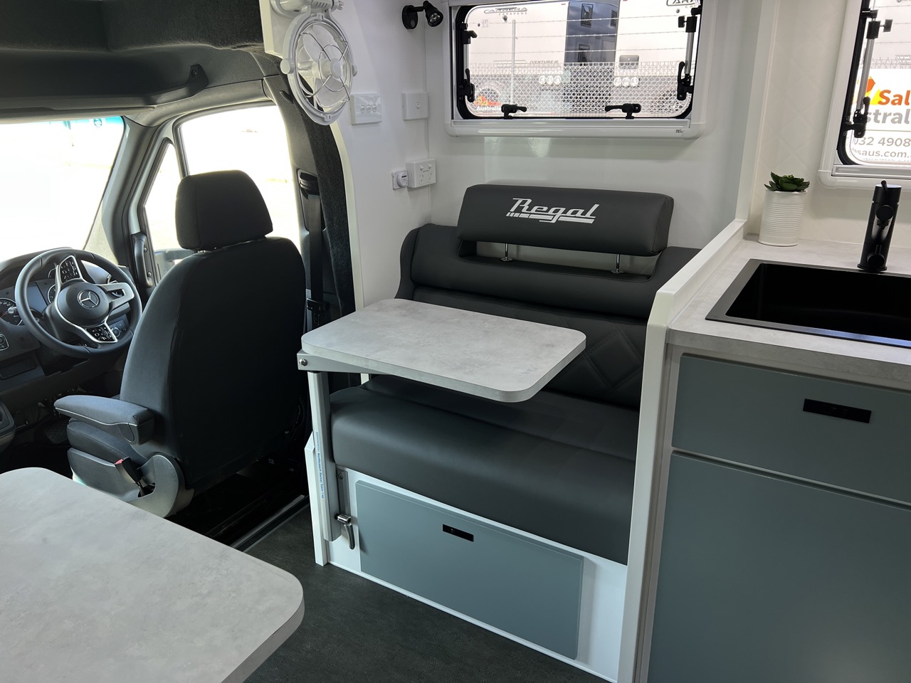 Seating area with 2 x Lagun adjustable table legs, adjustable headrest, map reading lights, USB/USBC Ports, LED strip lighting, double power points, fan & large drawer below seat