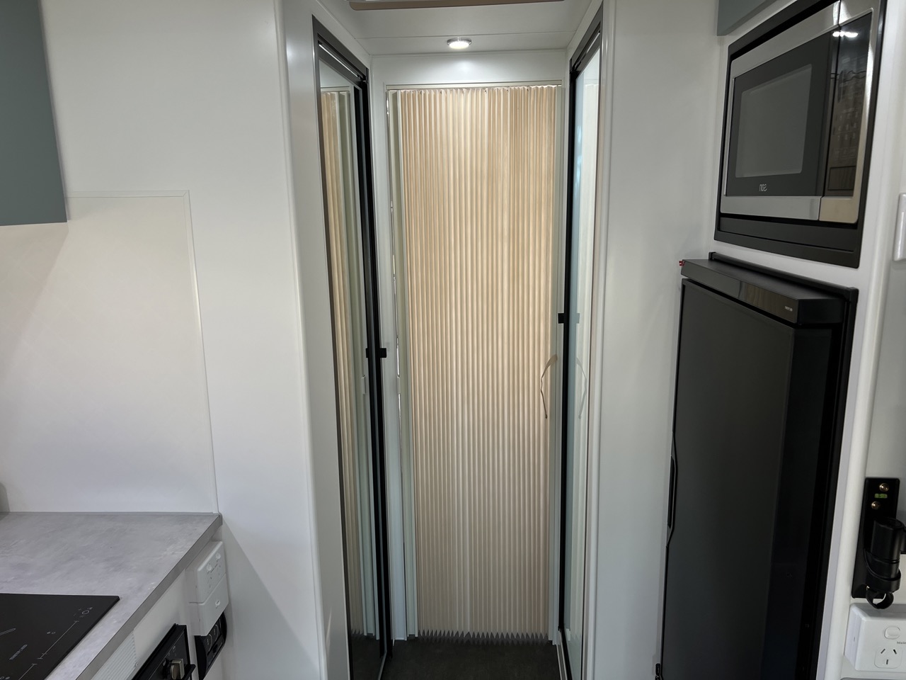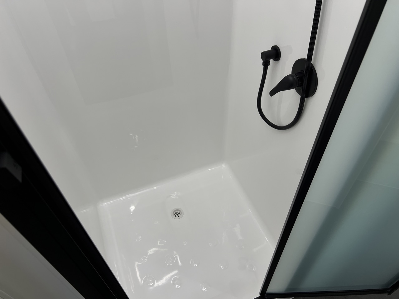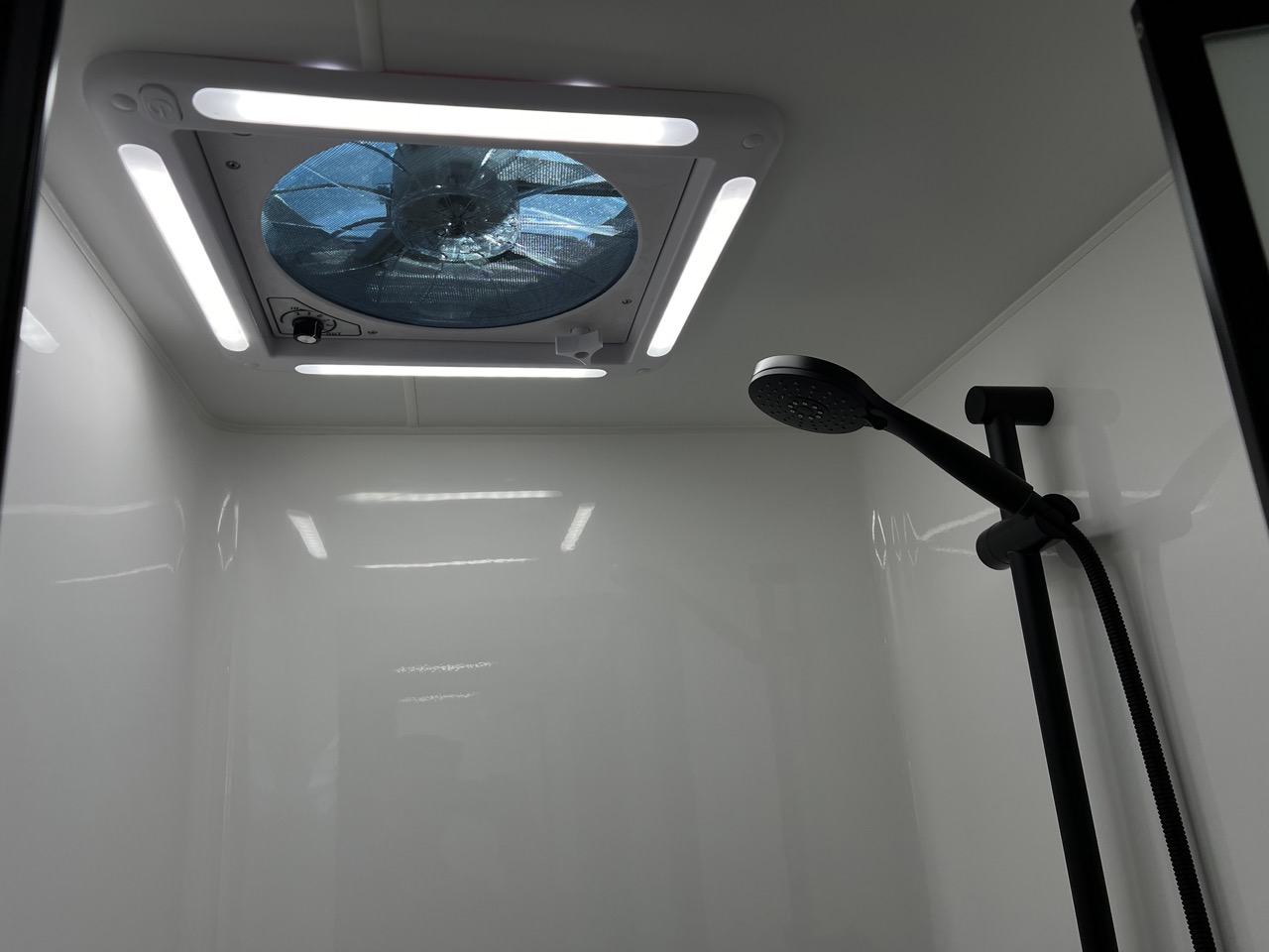 Large separate fibreglass shower with privacy door, black shower head, hatch & fan with LED
