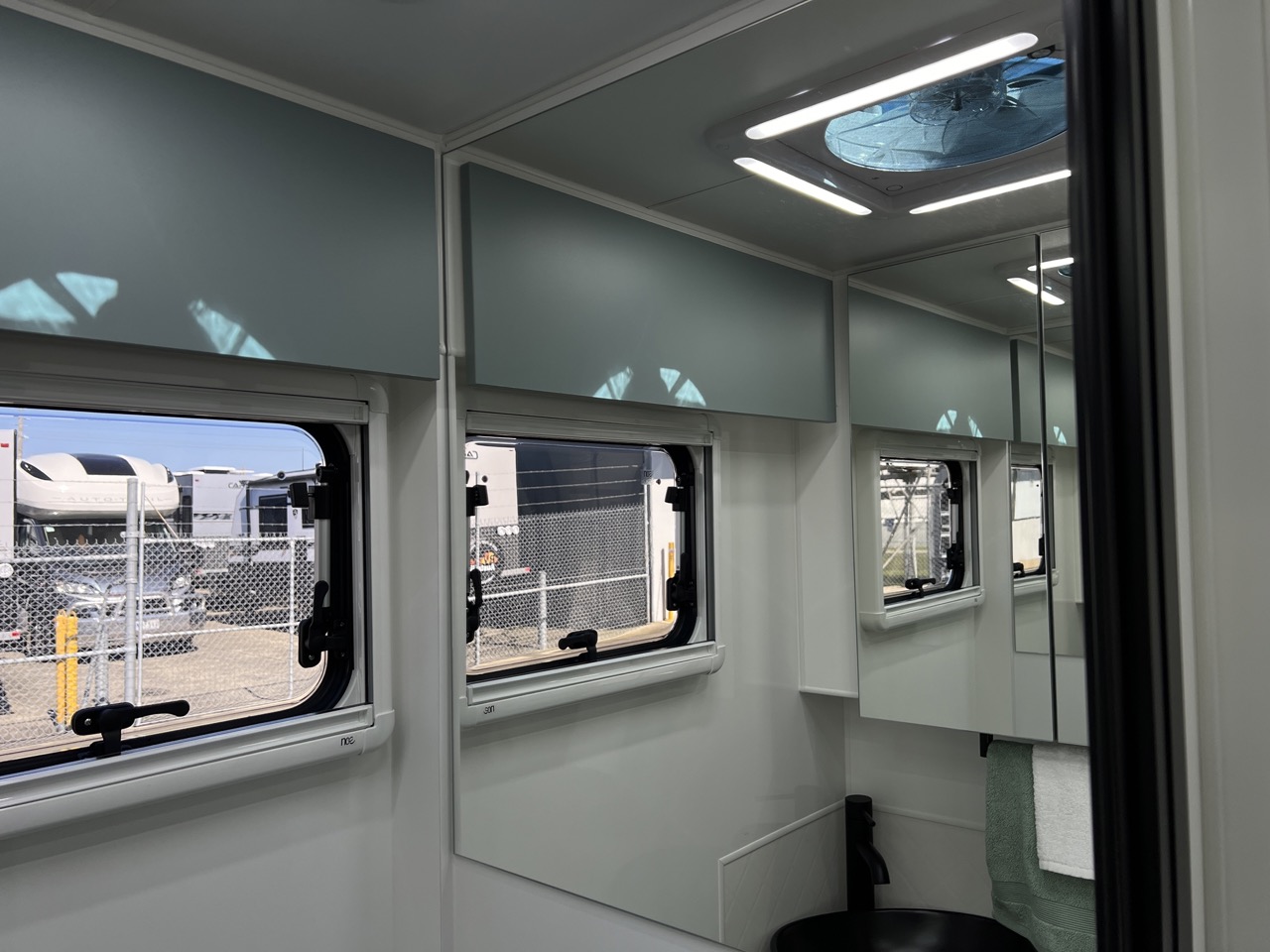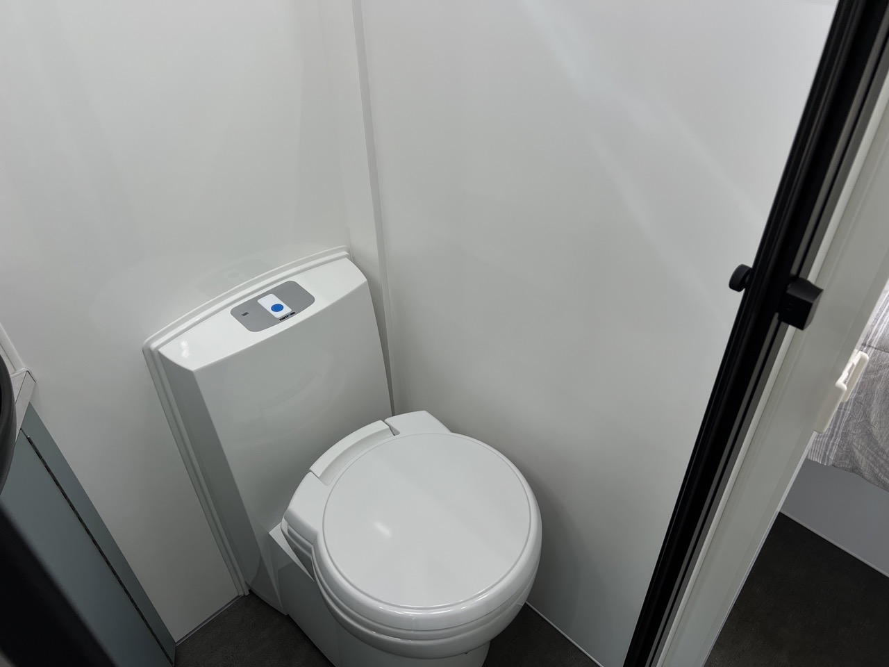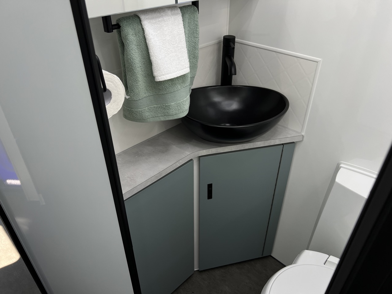 Large separate fibreglass shower with privacy door, black shower head, hatch & fan with LED