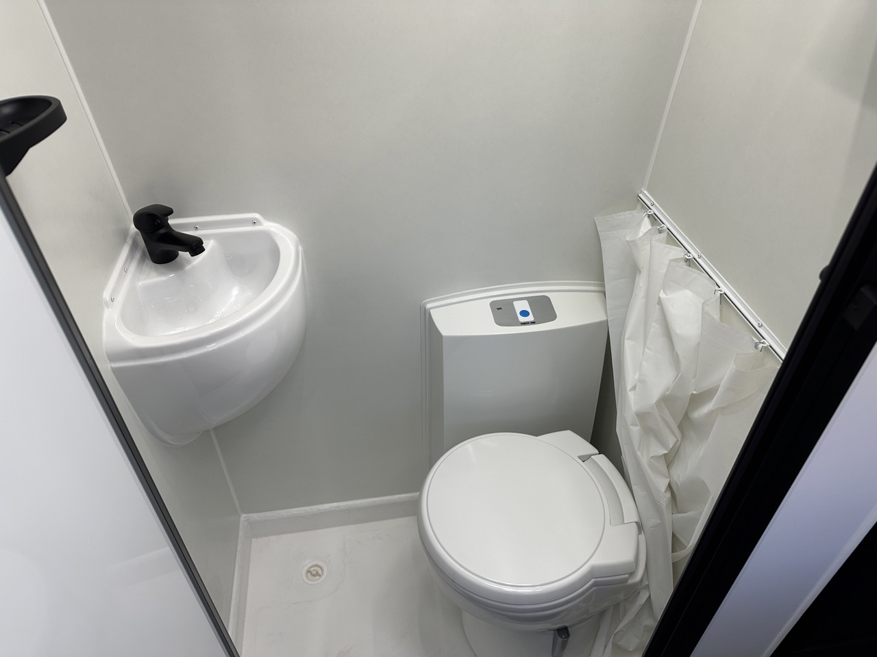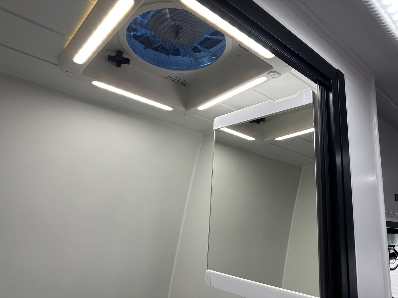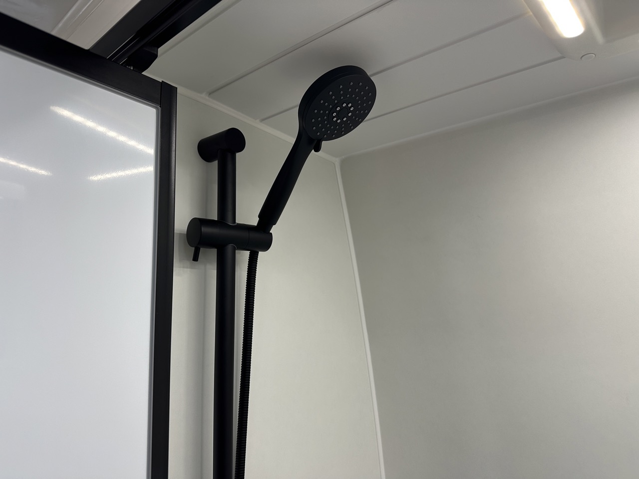 Shower with mirror door, black shower head, hatch/fan, sink & soapbox with mirror