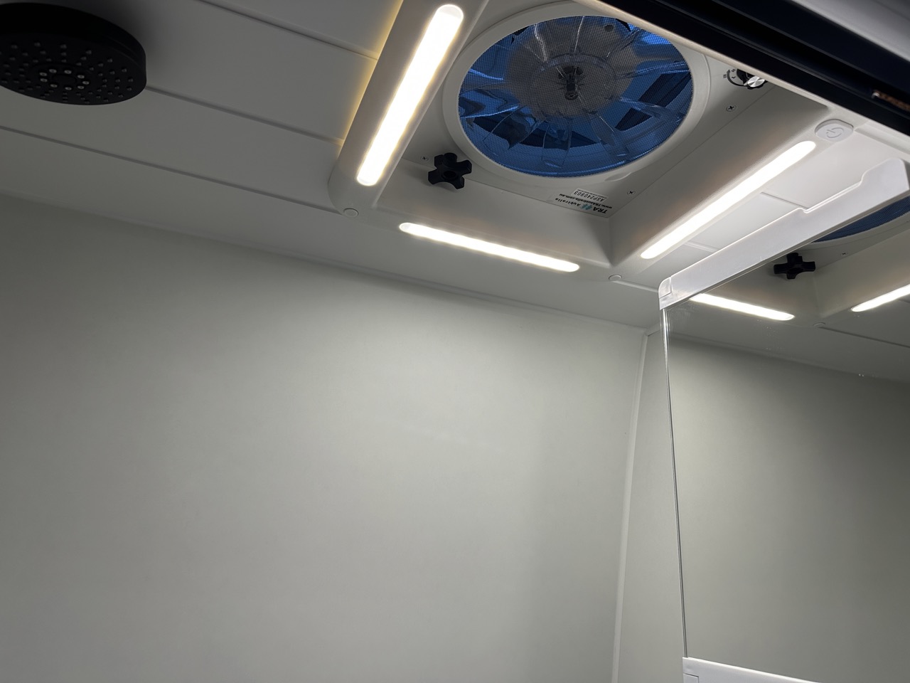 Shower with mirror door, black shower head, hatch/fan, sink & soapbox with mirror