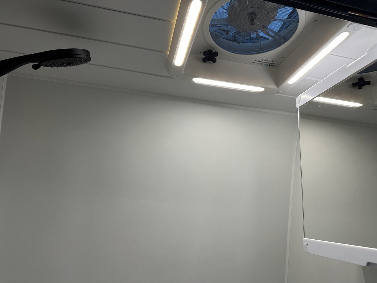 Shower with mirror door, black shower head, hatch/fan, sink & soapbox with mirror